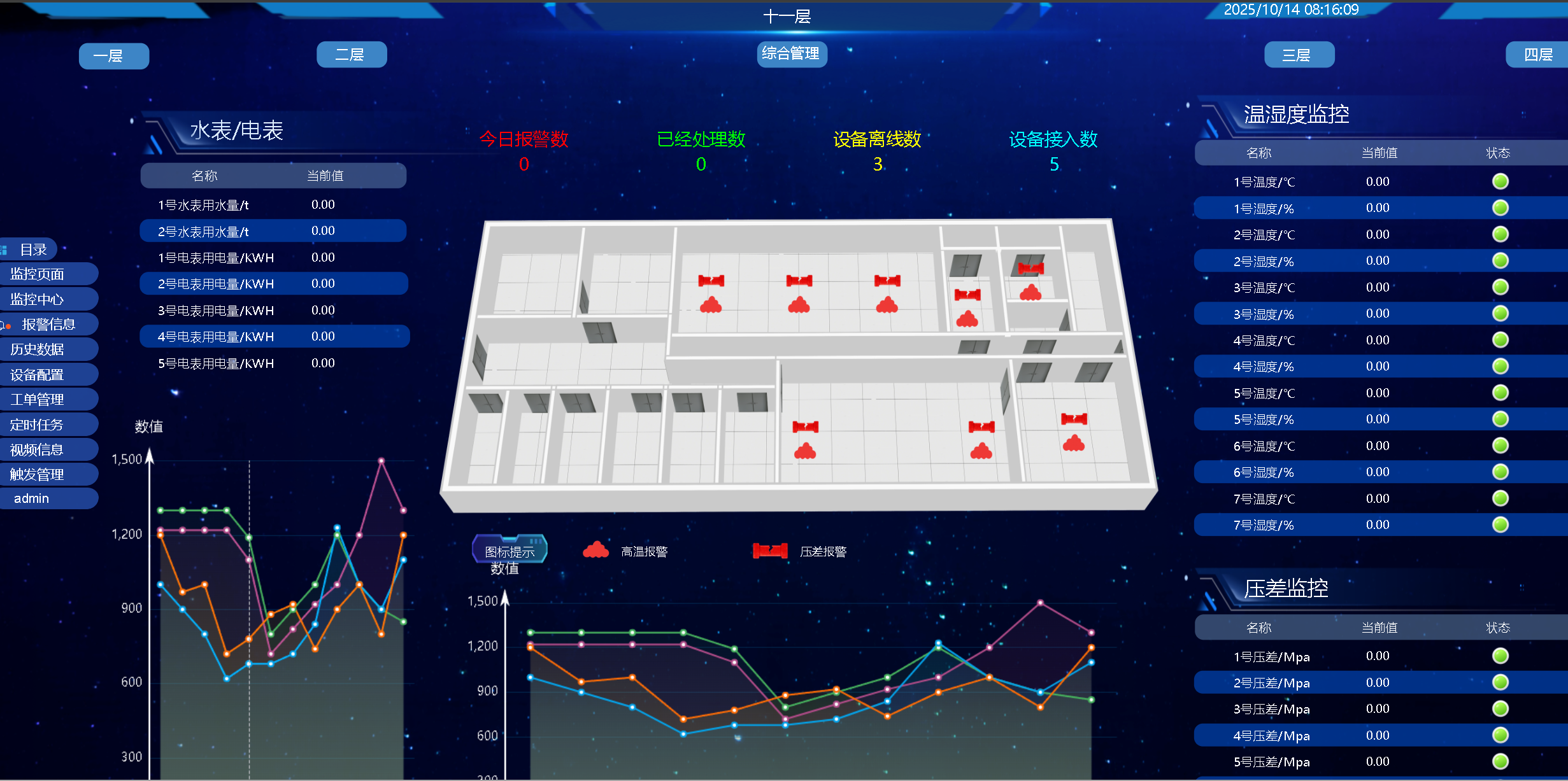 本方案旨在構建一個集環境監測與能耗管理于一體的智能化監控系統。系統通過集成溫濕度、壓差傳感器、電力儀表及智能水表等設備,實現對關鍵區域環境參數與能源消耗數據的全面、實時采集。